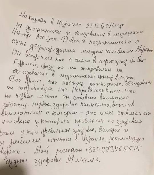 На моем пути встретился менеджер этой компании Mark Pinchasov.Сказать,что он сделал для меня много,ничего не сказать.Этот замечательный человек был постоянно со мной на связи,в любое время и даже в выходные,я получала практически мгновенные ответы на все свои сообщения.Через него я получала консультации онколога-гинеколога доктора ирены .С помощью Марка мне удалось решить не только медицинские вопросы,но также получить полную информацию по приезду,проживанию и др. организационным вопросам,а еще сэкономить значительную сумму денег.Кроме того,что для меня очень важно,я почувствовала к себе действительно человеческое отношение и желание помочь.